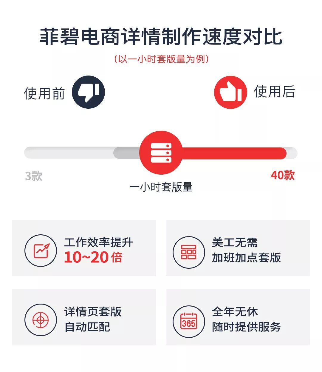 菲碧电商上新测款非常频繁,每天上新量高达200~300款。通常人工套一款详情页需要二十分钟左右,因此美工人员不得不加班加点去完成套版工作。而快麦详情机器人可以做到半小时制作20款详情页,工作效率是人工的10~20倍。并且全年无休,随时提供服务。