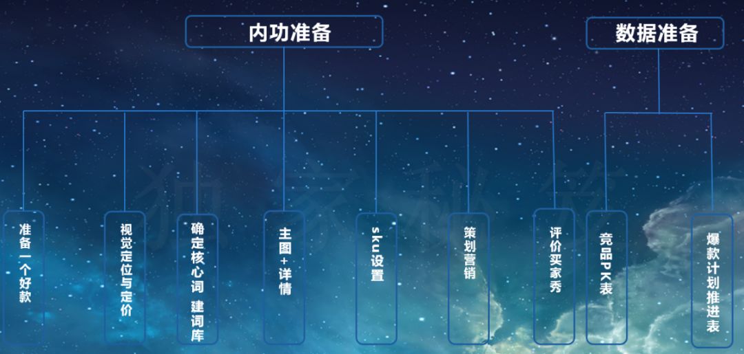 准备一个好的款、视觉定位与定价、确定核心词 建词库、主图+详情、sku设置、策划营销、评价买家秀。