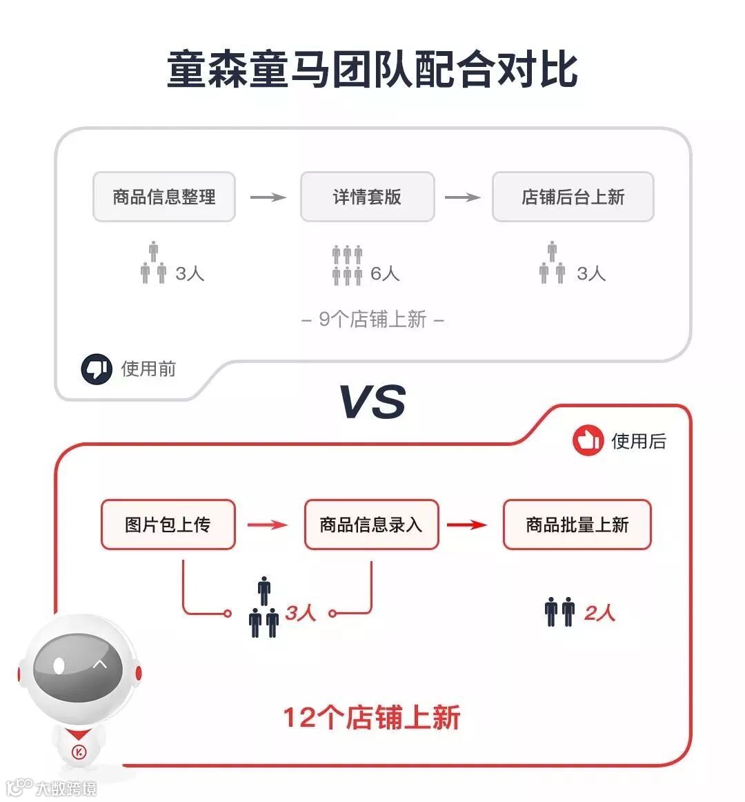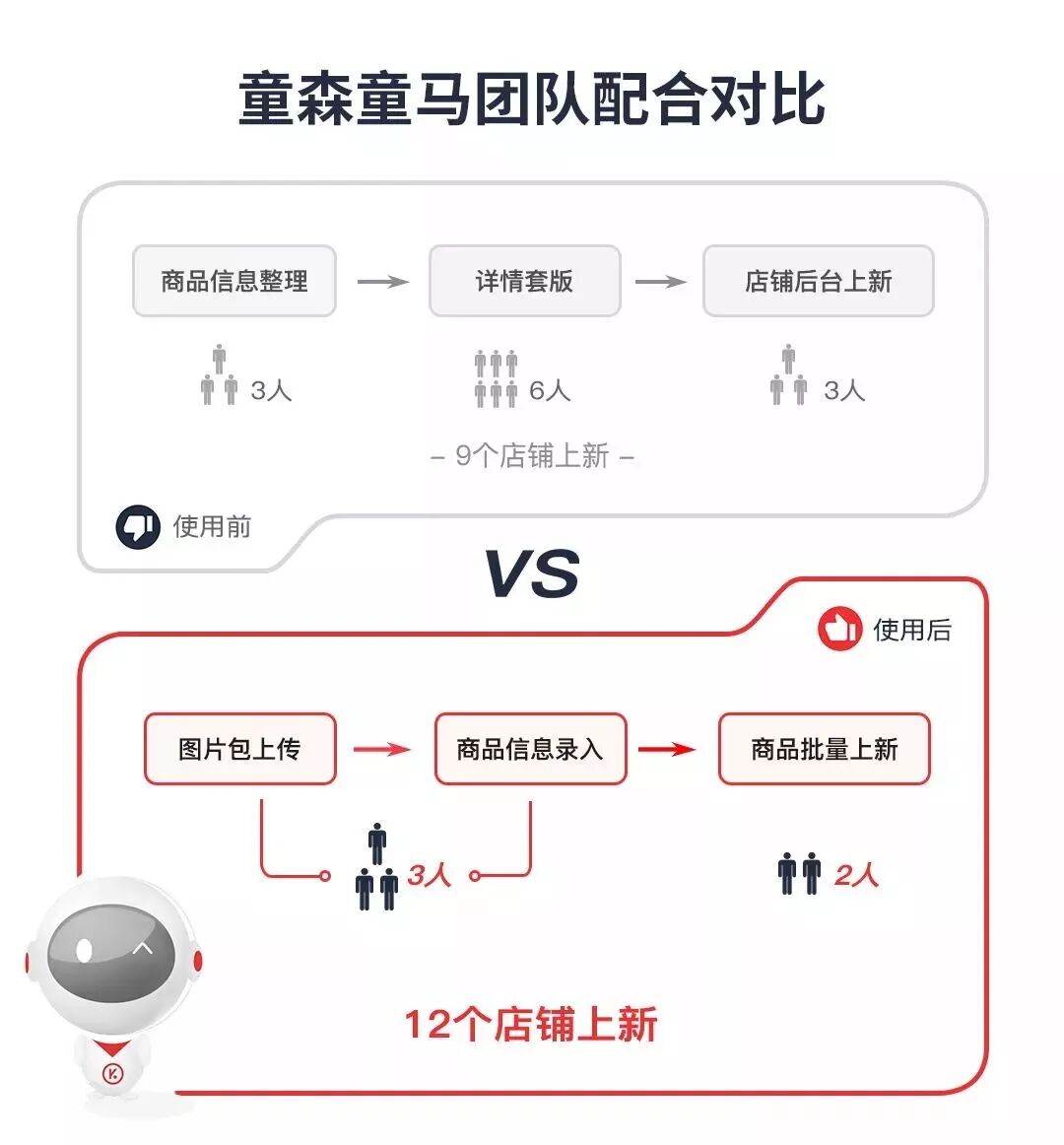 近几年,童森童马通过大量开通电商销售渠道来提升品牌覆盖度,并且取得了优异的成绩,所以在管理上非常重视团队的高效配合。跟快麦详情机器人合作之后,人员投入从原先的12人压缩至5人,并且还从原先9个店铺增加至12个店铺,加强团队高效配合的同时实现利润最大化。