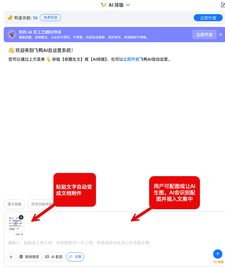 手动调整字号、行距,寻找分割线样式,重构段落……这些琐碎的操作占据了内容创作的大量时间。飞鸭AI的"AI排版"模块,你只需将文字(支持Word、PDF、纯文本甚至网页链接)粘贴进去,系统就能自动完成所有基础美化工作: