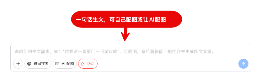 每天追热点、挖选题,是运营者的日常,也是痛苦的根源。而"命题生文"的第一重价值,就是成为你的灵感源泉。你只需输入一个关键词、一个模糊的想法,甚至只是一句话,AI就能为你生成一篇结构完整的图文初稿。
