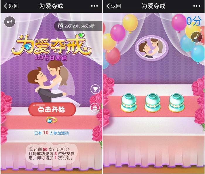 婚庆、鲜花、娱乐或者餐饮、商城、广告、本地生活服务类公众号等,可以利用这几款游戏在“520”期间做做小活动;设置些奖品,比如电影票、玫瑰花、巧克力、优惠券等等,结合节日的气氛,极易和粉丝形成互动。