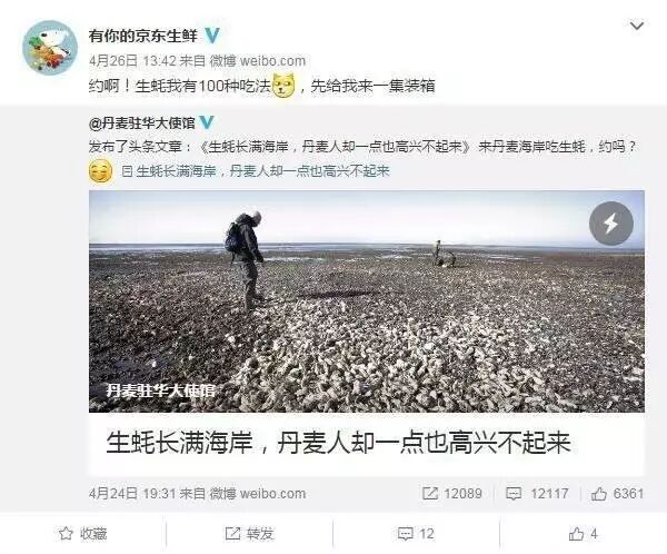 丹麦相关人员表示:“感谢京东商城生鲜事业部第一时间对生蚝泛滥事件的关注,我们将情况向有关部门反馈,并及时与京东再次联系。”