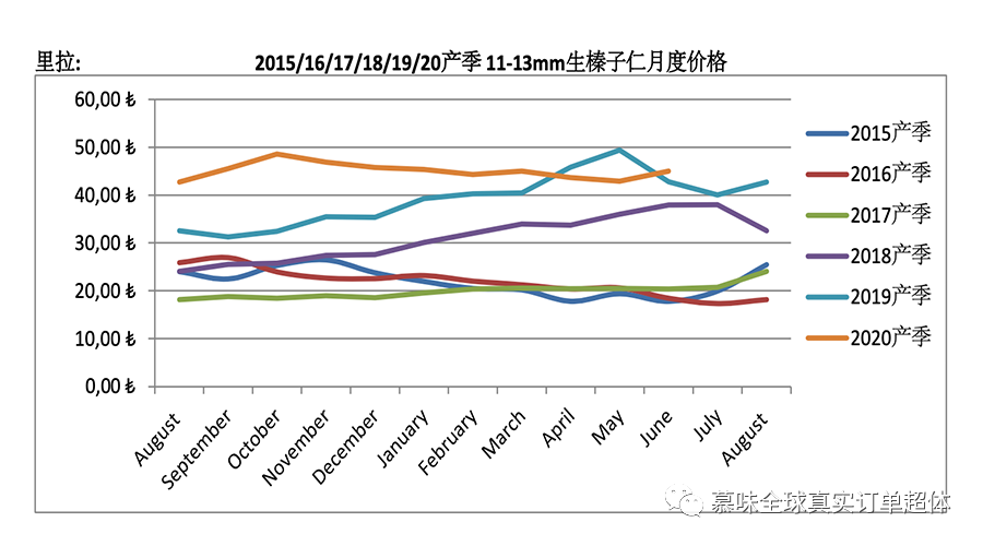 从近5年来看,土耳其榛子价格一直处于上涨趋势,19-20产季尤为明显,反观今年近几个月的价格趋势,却有小幅度的波动。