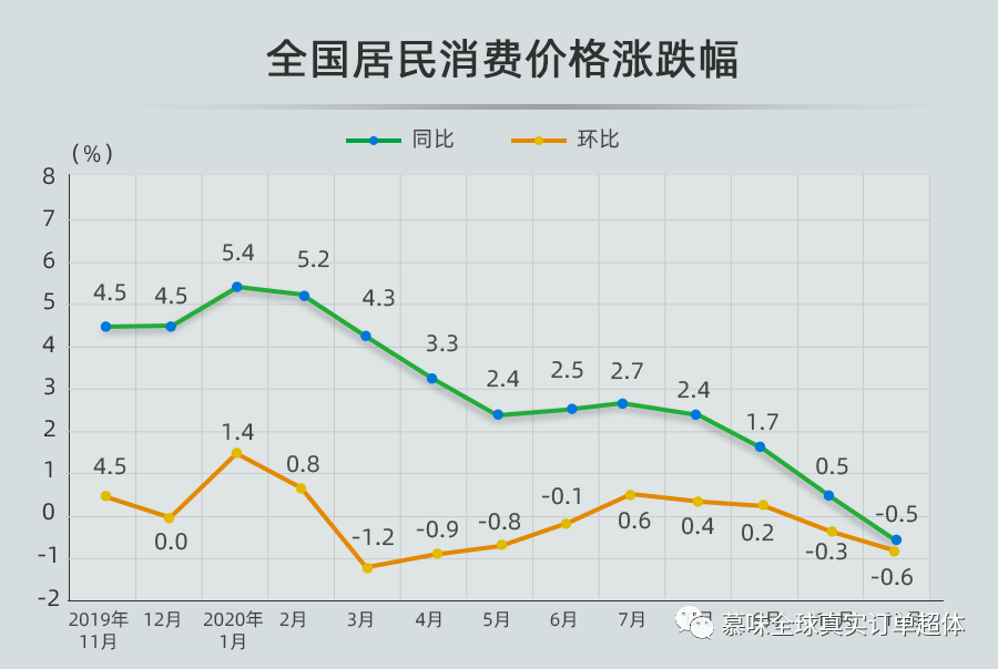 12月9日国家统计局数据显示,2020年11月份,全国居民消费价格同比下降0.5%。其中,城市下降0.4%,农村下降0.8%;食品价格下降2.0%,非食品价格下降0.1%;消费品价格下降1.0%,服务价格上涨0.3%。扣除食品和能源价格的核心CPI同比上涨0.5%。1—11月,全国居民消费价格比去年同期上涨2.7%。