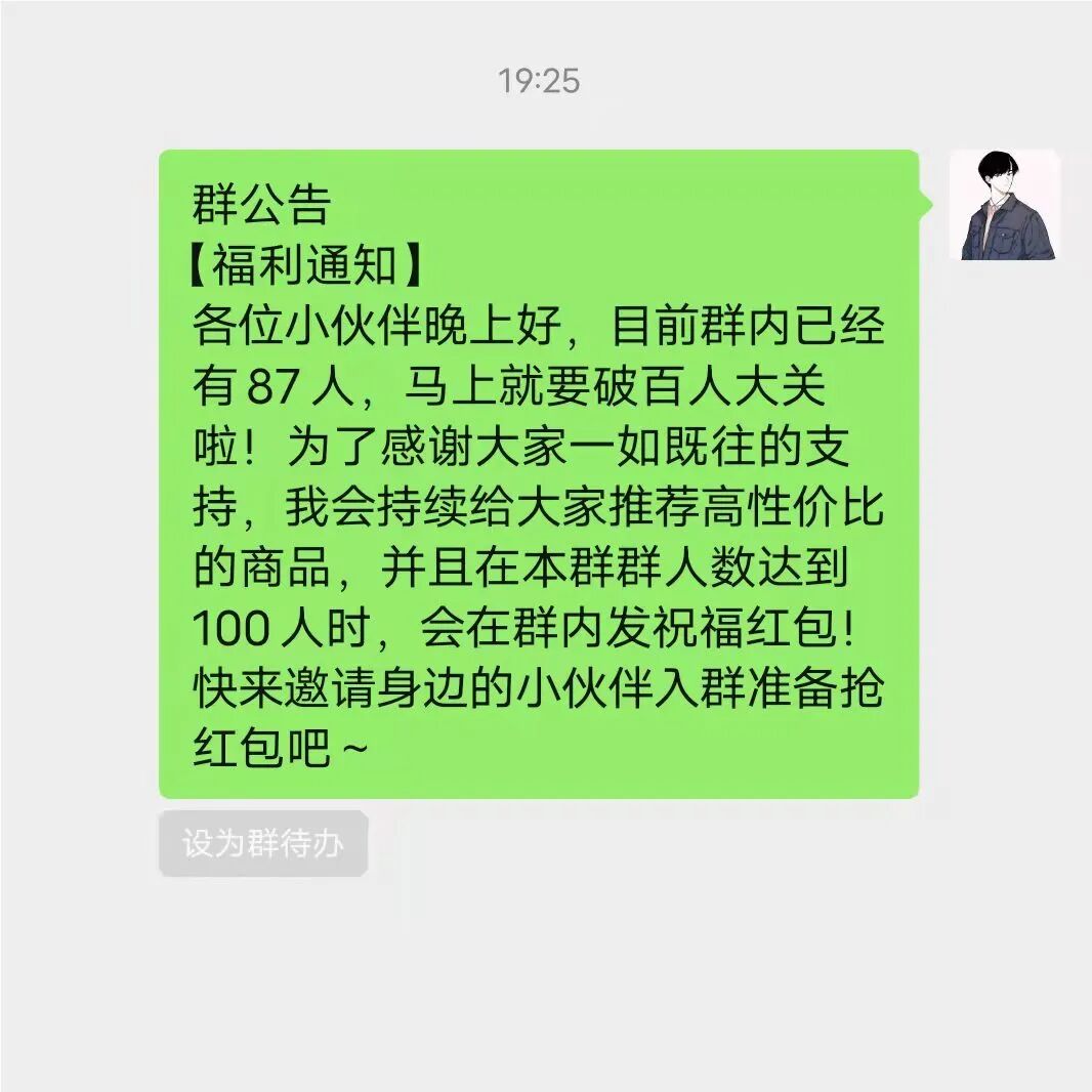 设置一个可实现的群目标人数,达到目标人数则在群里发红包。例如现在群内有100人,目标人数可设置为当前人数的1.1倍或者1.2倍为110—120人。
