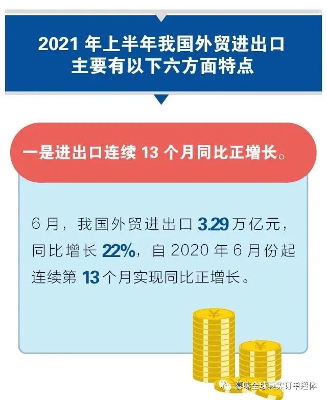 进出口连续13个月同比正增长。2021年6月,我国外贸进出口3.29万亿元,同比增长22%,自2020年6月份起连续第13个月实现同比正增长。