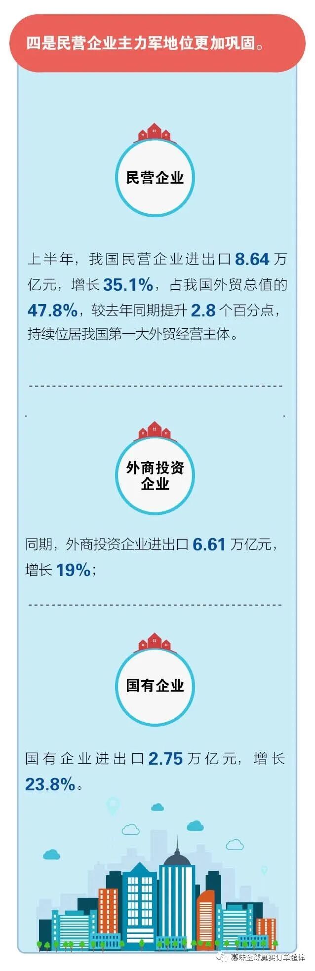 民营企业主力军地位更加巩固。上半年,我国民营企业进出口8.64万亿元,增长35.1%,占我国外贸总值的47.8%,较去年同期提升2.8个百分点,持续位居我国第一大外贸经营主体。同期,外商投资企业进出口6.61万亿元,增长19%;国有企业进出口2.75万亿元,增长23.8%。