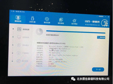 2.首先会进行“系统检测”,完成后进行下一步:(需连接网络)