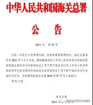 2021年6月17日,海关总署发布2021年第43号公告,7月1日起,增加输泰国的《中华人民共和国与东南亚国家联盟全面经济合作框架协议》《中华人民共和国政府和毛里求斯共和国政府自由贸易协定》项下原产地证书为可自助打印证书。公告原文: