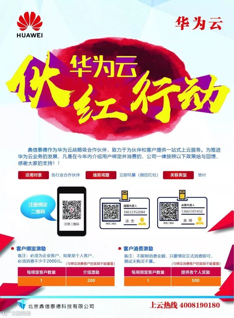 为了能够让华为云更多的服务有需要的用户,也为了让合作伙伴能更多的了解华为云产品,推动客户和合作伙伴上云,作为华为云战略合作伙伴的北京鼎信泰德科技有限公司推出了伙红行动,时间截止到2019年12月31日,具体内容如下: