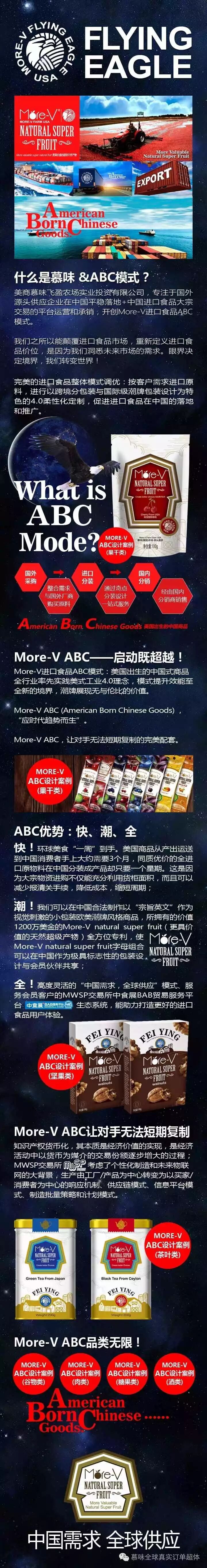 导读:慕味进口食品ABC模式:美国出生的中国式商品。全行业率先实践美式工业4.0理念,模式提升效能至全新的境界,潮牌展现无与伦比的价值。More-V ABC (American Born Chinese G