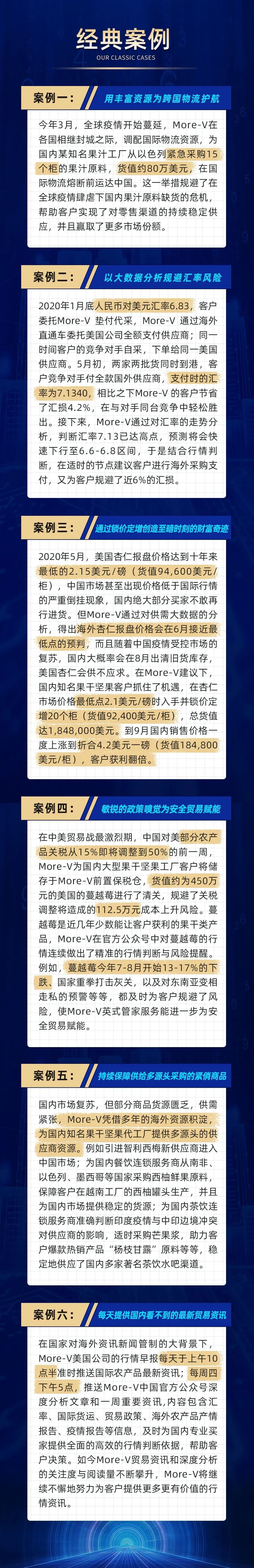 More-V智慧贸易服务平台,秉持着为客户赚更多的钱的理念,用实力说话。抛开传统单一的贸易思维,我们透过数据来变现收益,通过整合客户交易数据,链接仓储、垫资、清关、物流等资源,将优化后的成本进行返利,实现期货交易实体化,进口食品金融化。从源头到终端,More-V只做前端落地服务,与国内进口企业强强联手打造新贸易、新业态。不是困境让我们止步不前,是困境驱动着我们向财富“钱”进!