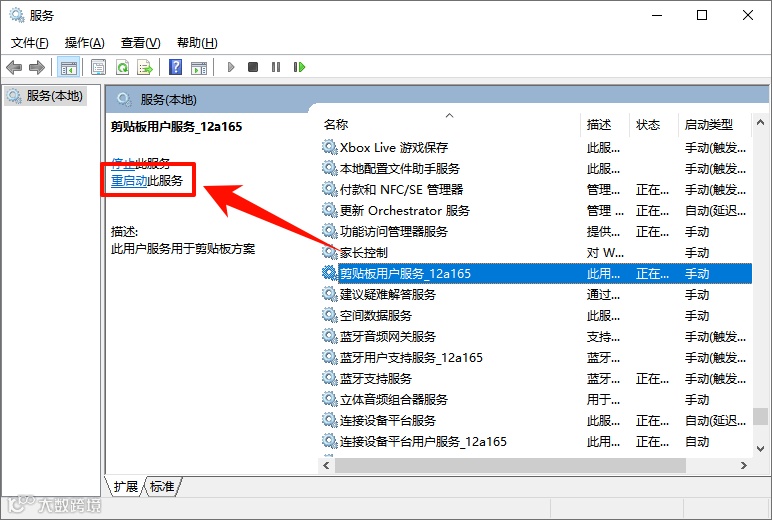 Step2:按「Win+R」输入services.msc打开“服务”窗口;找到「剪贴板用户服务」(英文:Clipboard User Service),右键选择「重启」。