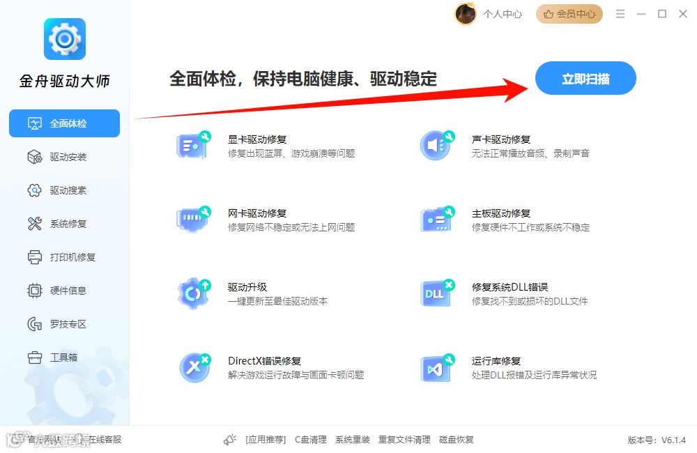 Step1:安装并打开“金舟驱动大师”,点击“全面体检”-“立即扫描”。