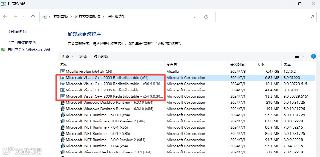 第2步:在列表中找到并卸载所有Microsoft Visual C++ Redistributable 包(通常有多个年份版本)。