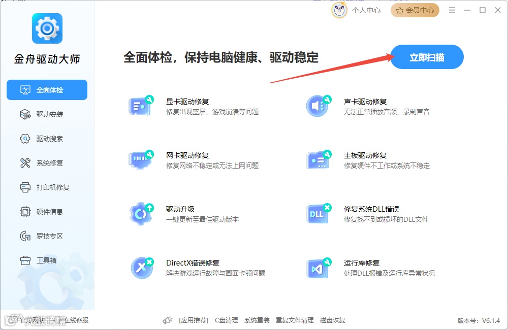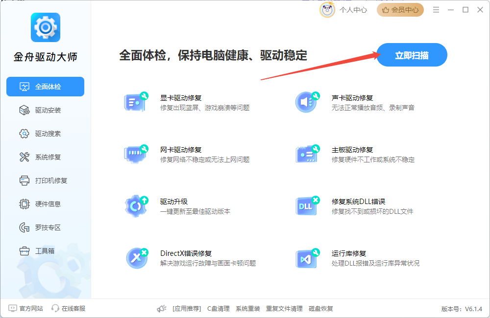 第2步:打开软件,点击主界面的“立即扫描”按钮,软件将自动扫描电脑驱动及相关系统异常项。