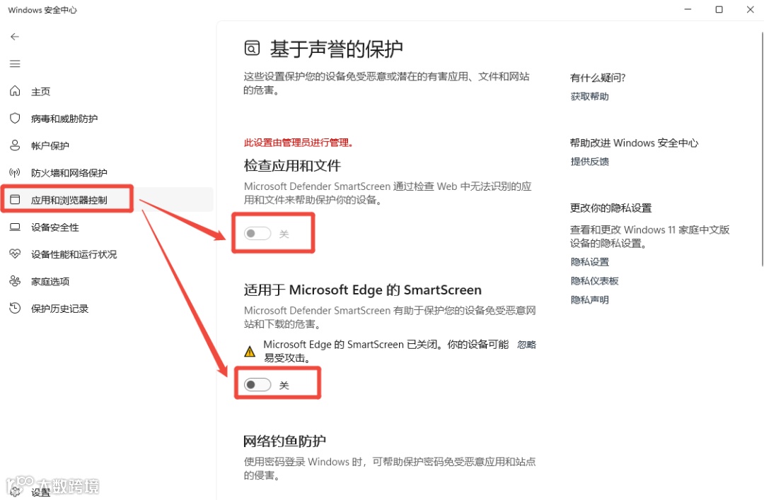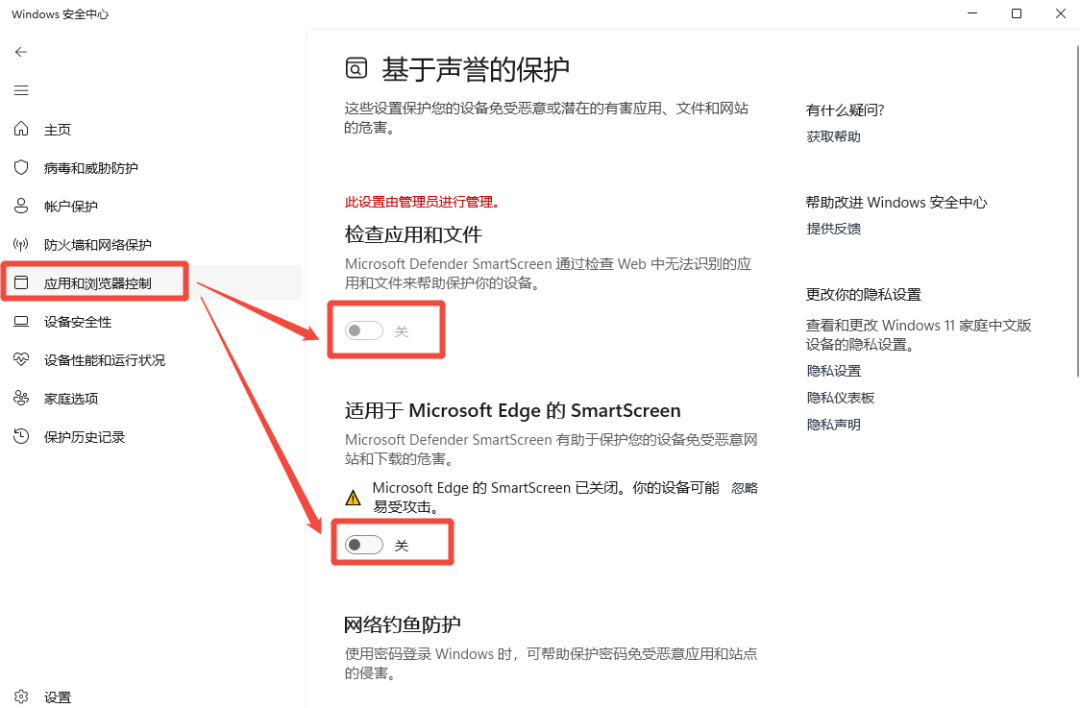 打开设置→更新和安全→ Windows安全中心→应用和浏览器控制→ 基于声誉的保护设置,选择关闭“检查应用和文件”和“适用于Microsoft Edge的SmartScreen”的开关按钮。