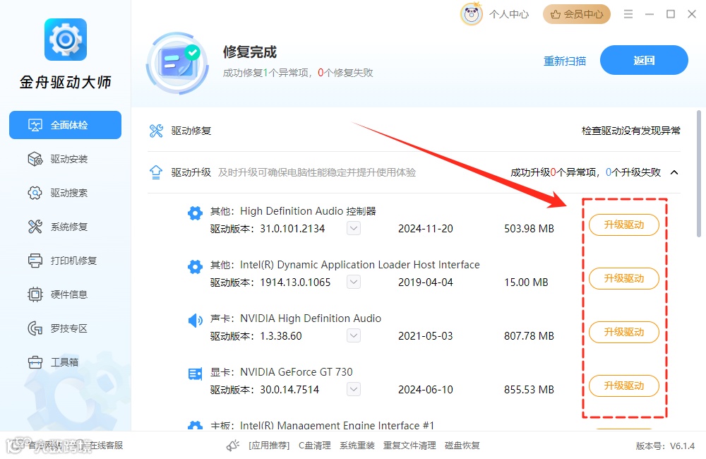 4.修复完成后,在驱动升级列表中找到显卡驱动和网卡驱动,点击【升级驱动】,软件会自动下载并安装,完成驱动的更新。