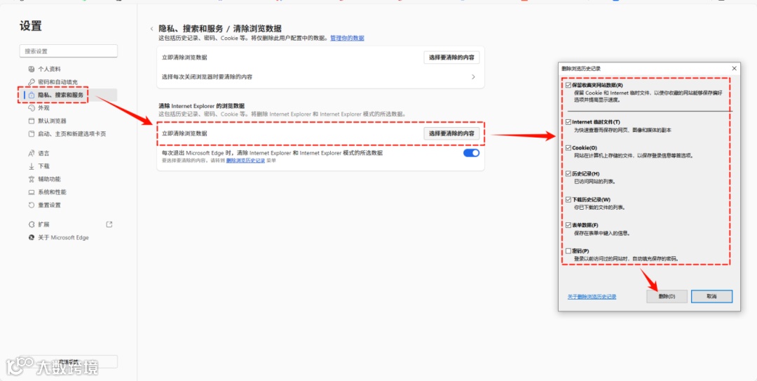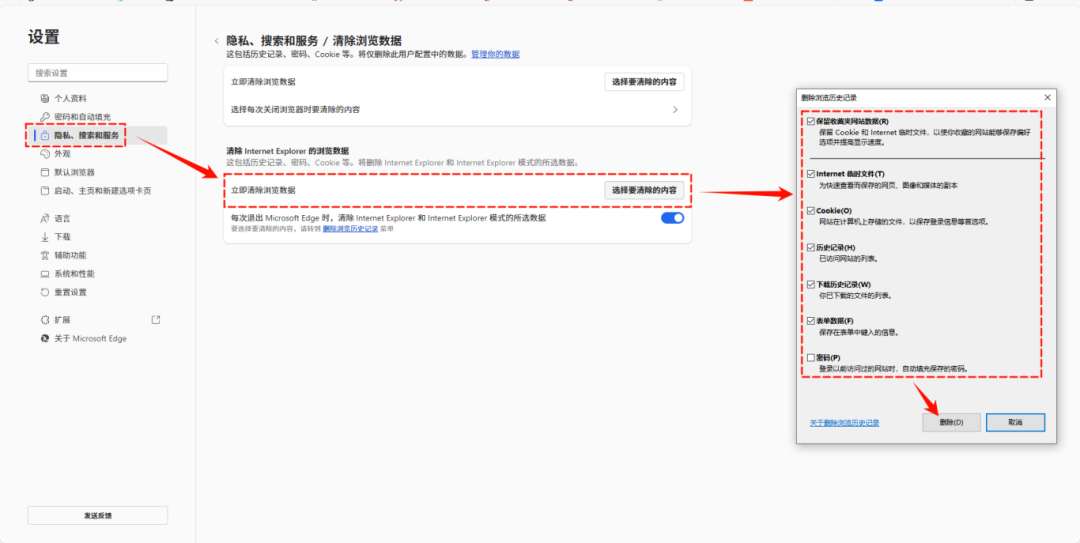 清除浏览器缓存:点击浏览器右上角【...】→【设置】→【隐私、搜索和服务】→【立即清除浏览数据】,选择好要清除的内容后点击【删除】。