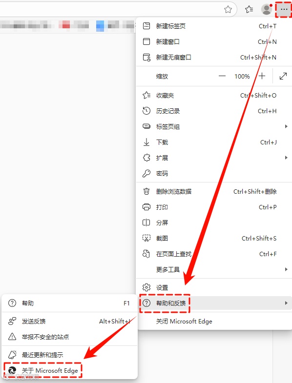 检查Edge浏览器更新:点击浏览器右上角【...】→【帮助和反馈】→【关于Microsoft Edge】。