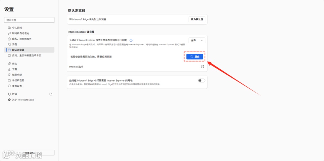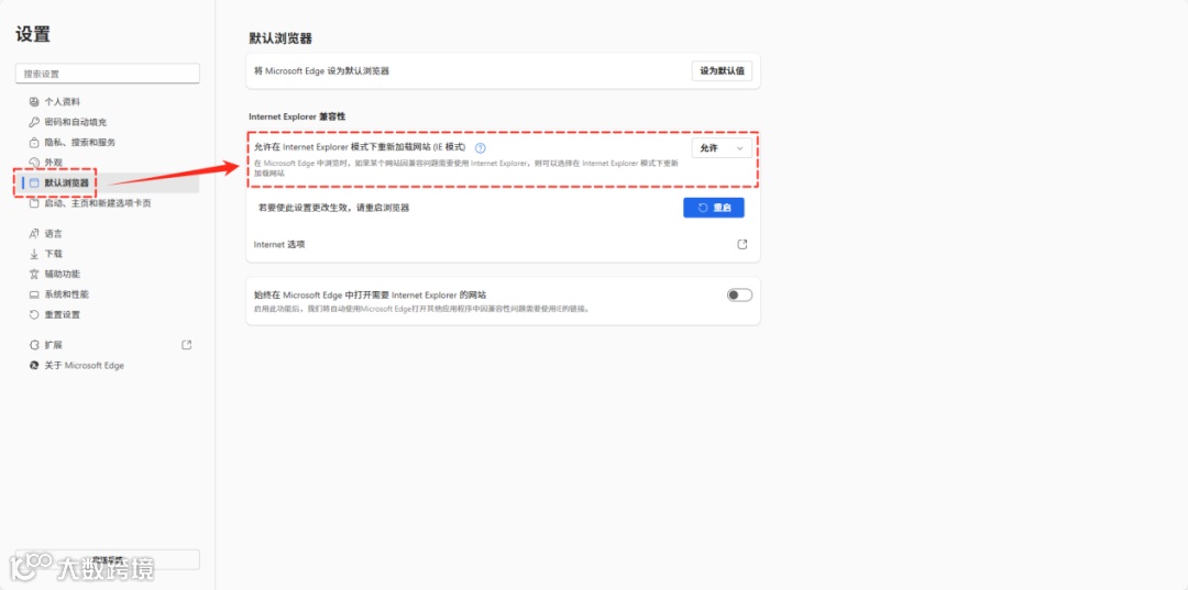 2.点击【默认浏览器】,找到【允许在Internet Explorer模式下重新加载网站(IE模式)】选项,将其设为【允许】;