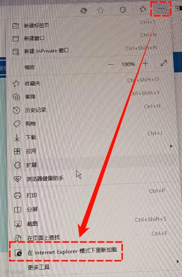 2.点击浏览器右上角的【...】菜单,选择【在Internet Explorer模式下重新加载】;