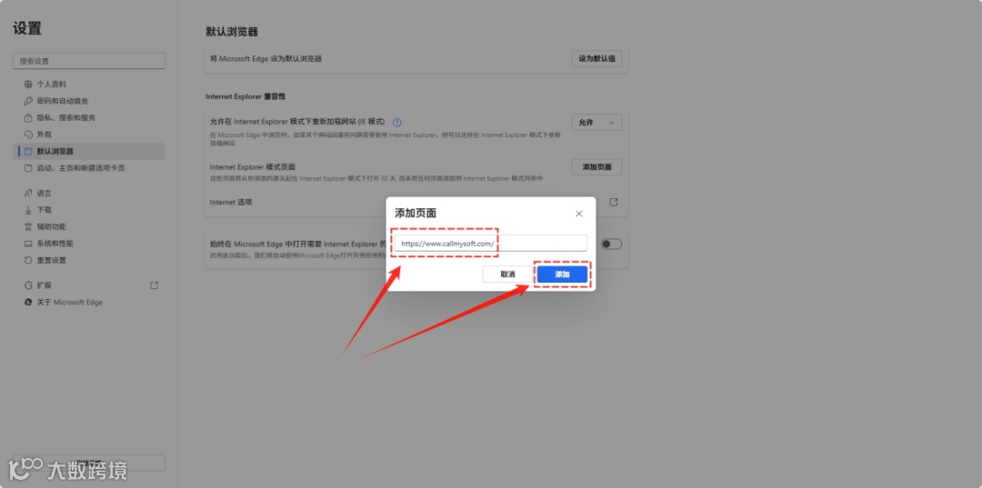 2.在【Internet Explorer模式页面】部分,点击【添加页面】按钮,在弹出的输入框里粘贴目标网站的完整地址(必须包含http://或https://);