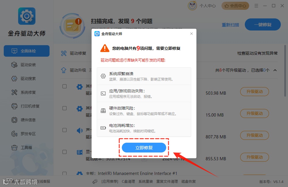 3.扫描完成后,点击【立即修复】,软件会一键修复异常驱动问题;
