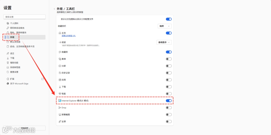 ⭕如果在【...】菜单中没有找到【在Internet Explorer模式下重新加载】选项,则进入【设置】→【外观】→【工具栏】,在工具栏中开启【Internet Explorer模式(IE模式)】即可。