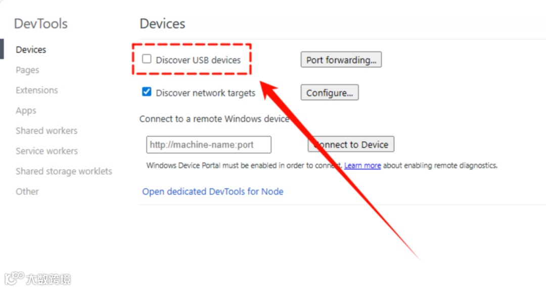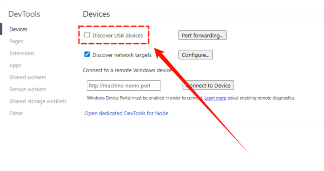 关闭远程调试:在地址栏输入“edge://inspect”并访问,进入开发者工具页面;找到并取消勾选【Discover USB devices】等相关选项,然后重启浏览器。