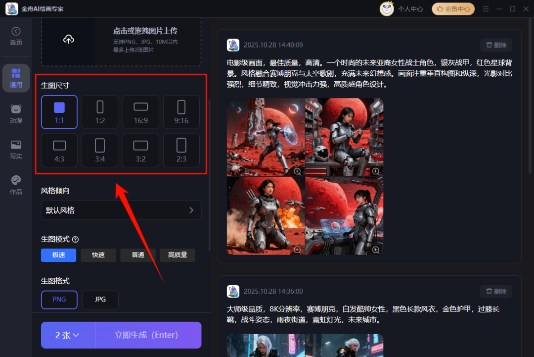 Step3:选择图片生成的尺寸,根据不同使用场景进行选择,例如头像常规是1:1、封面图16:9、竖版海报9:16等等。