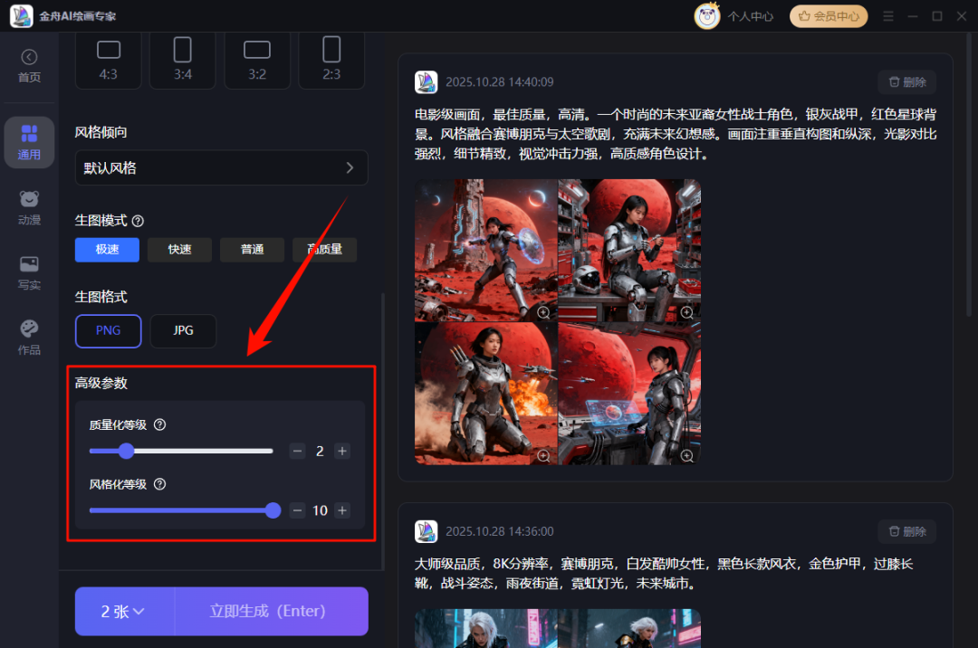 Step6:生图格式默认为PNG(画质更高),可手动切换为JPG(文件更小);选择格式后,还可以调节【质量化等级】(1-4级,越高细节越丰富)和【风格化等级】(1-4级,越高风格越多样)。