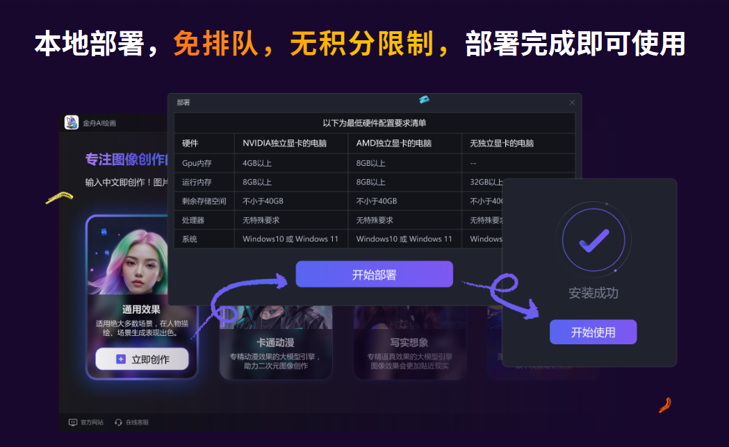 模型部署在用户本地电脑,无需依赖云端服务器,免排队、无积分限制;部署完成后可随时生成图片,生成的作品直接保存在本地,保护内容隐私。