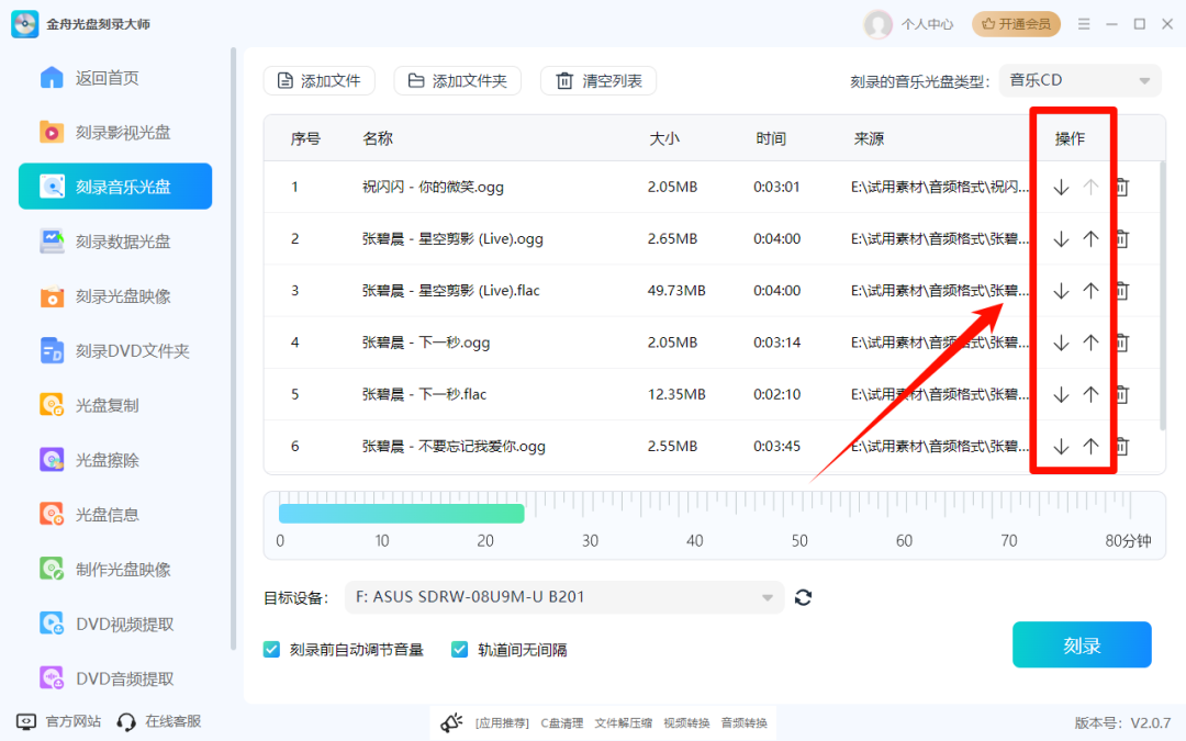 Step3:可在刻录软件中对添加的音乐进行排序,按自己想要的播放顺序上下拖动音乐文件。