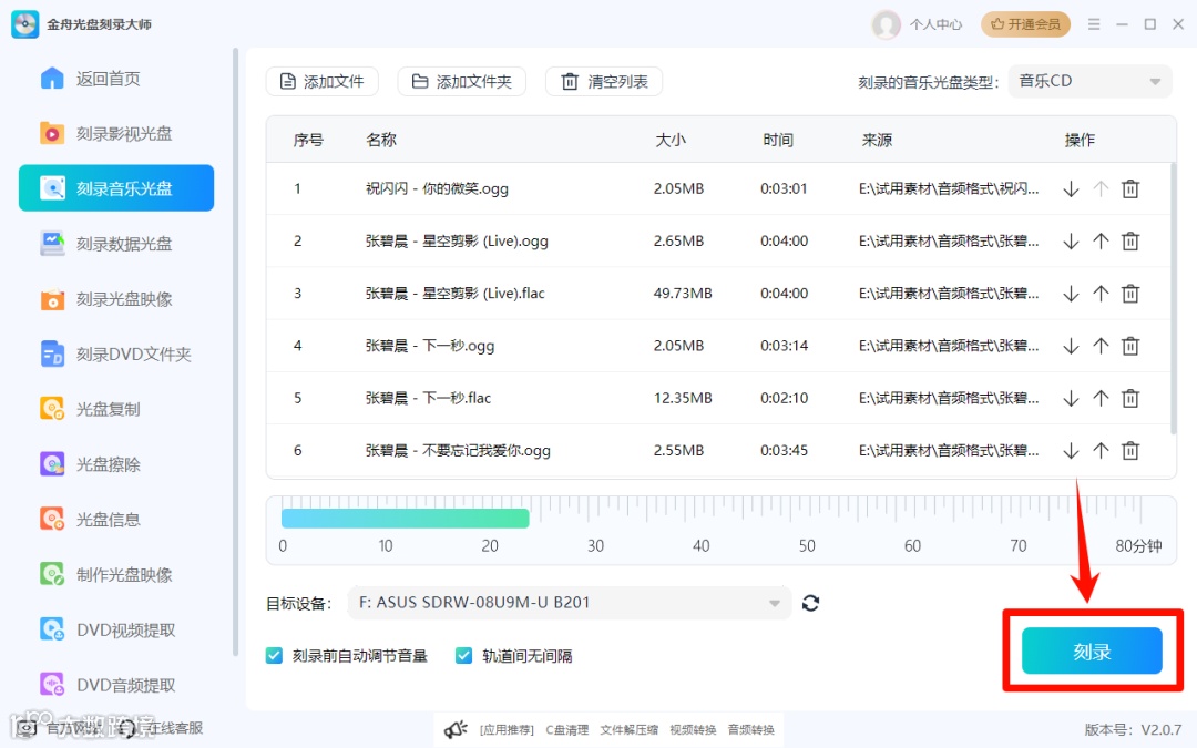 添加时注意光盘容量限制,一张标准CD容量约700MB,对应约80分钟音乐。