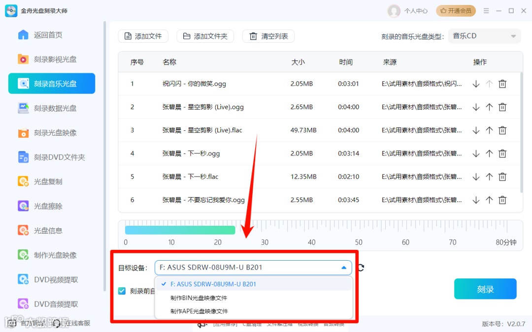 Step4:软件显示音乐的大小,时长,以及文件保存位置。想要刻录音乐cd先选择「目标设备」。
