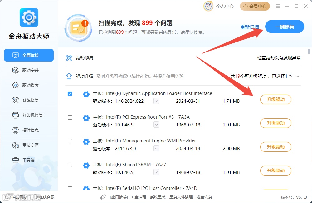 第3步:根据提示点击“一键修复”或选择某个驱动“升级驱动”