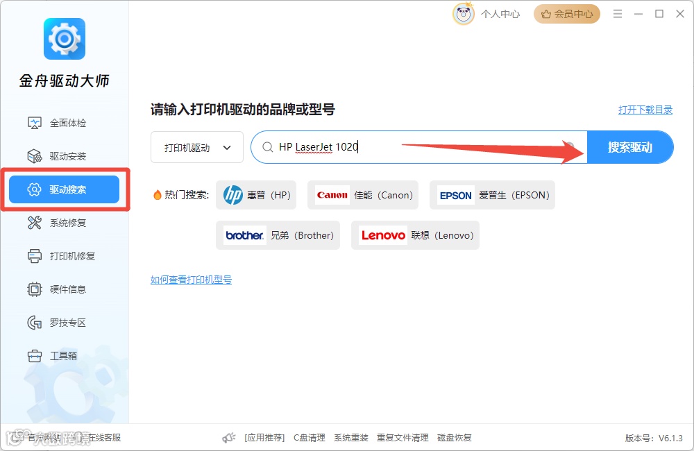 第4步:软件内置海量驱动资源库,也可选择“驱动搜索”,输入设备型号(如“HP LaserJet 1020”)搜索,也可一键下载自动安装。