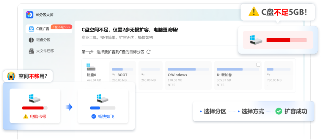 ✅扩容C盘过程简单高效,只需几步操作: