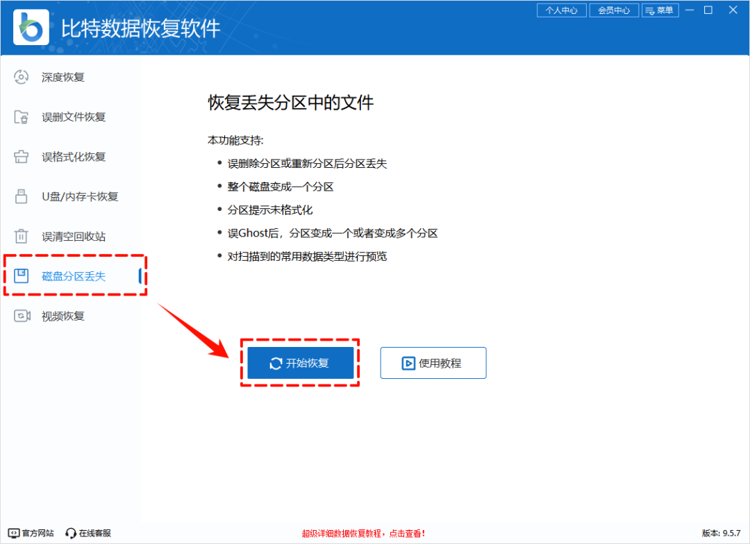 Step2:运行“比特数据恢复软件”,界面选择“磁盘分区丢失”,立马开始扫描。