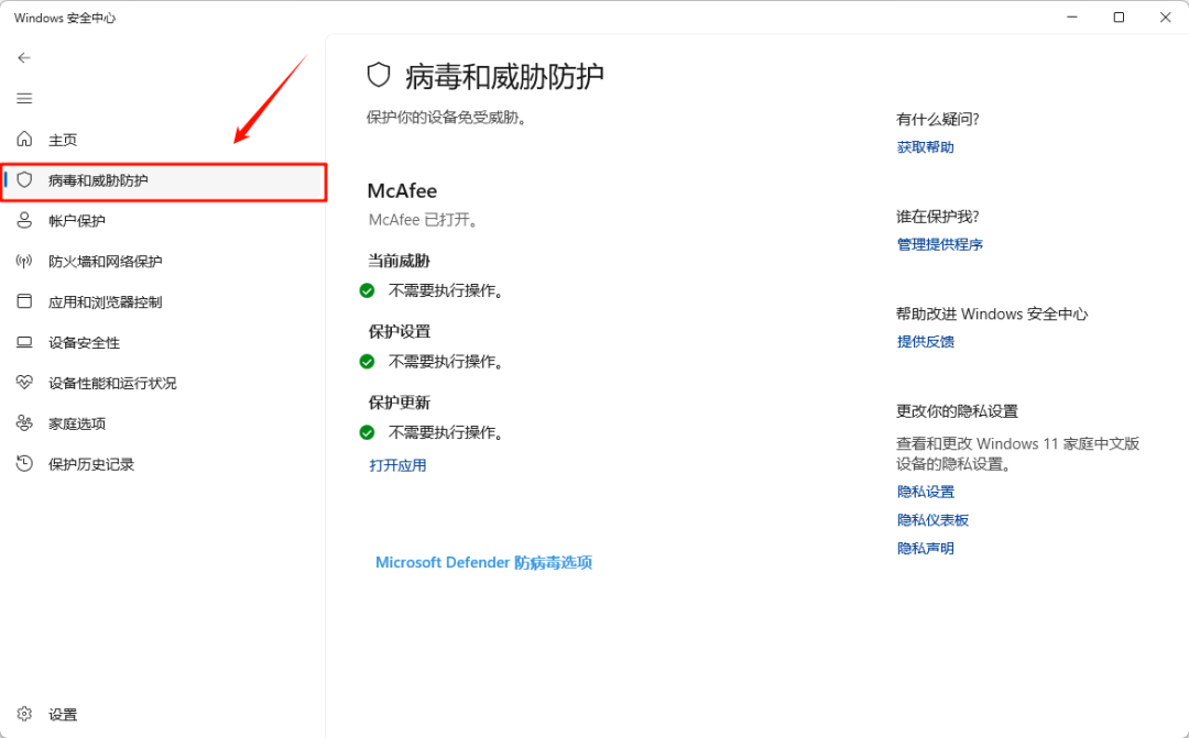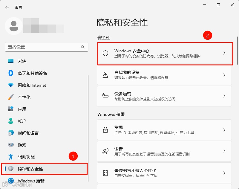 1.打开设置,左侧找到「隐私和安全性」,进入「Windows安全中心」