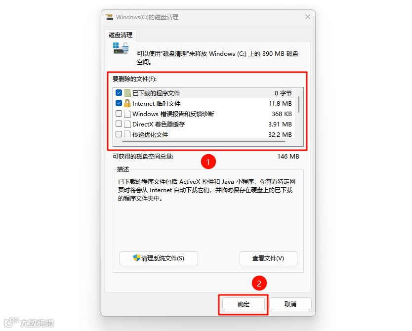 3.勾选「临时文件」、「缩略图」等要清理的文件,确认清理系统文件