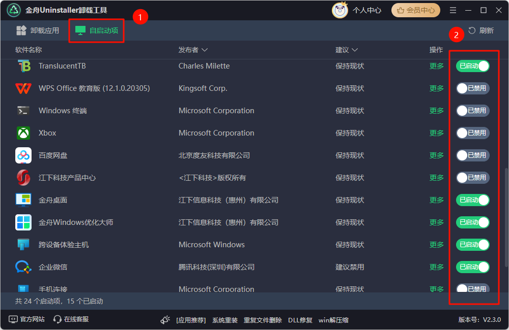 打开金舟Uninstaller卸载工具,选择「自启动项」页面,在右侧选择不常用的软件,关闭自启动