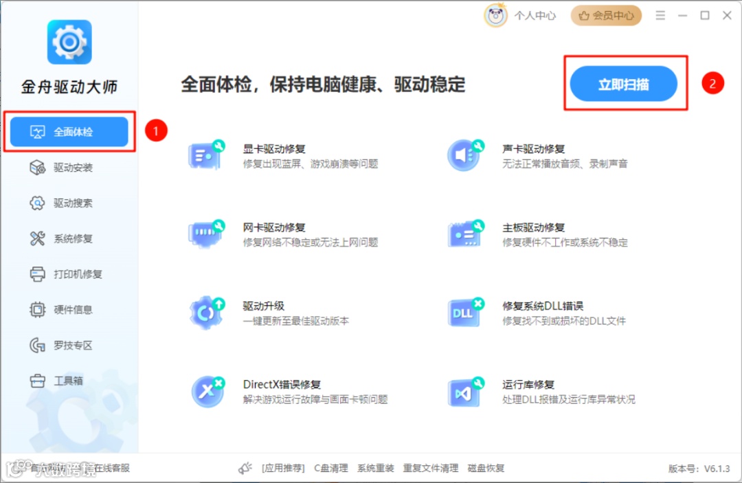 1.打开金舟驱动大师,找到「全面体检」,选择「立即扫描」