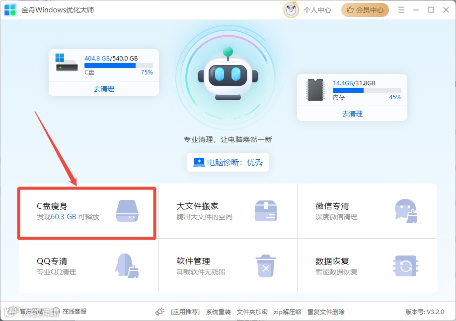 步骤2:打开软件,在主界面找到并点击 “C盘瘦身” 模块,软件会自动全面扫描C盘的可清理项目。