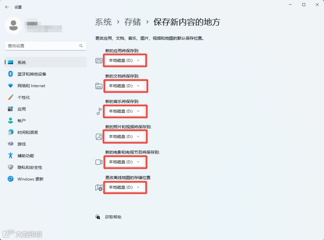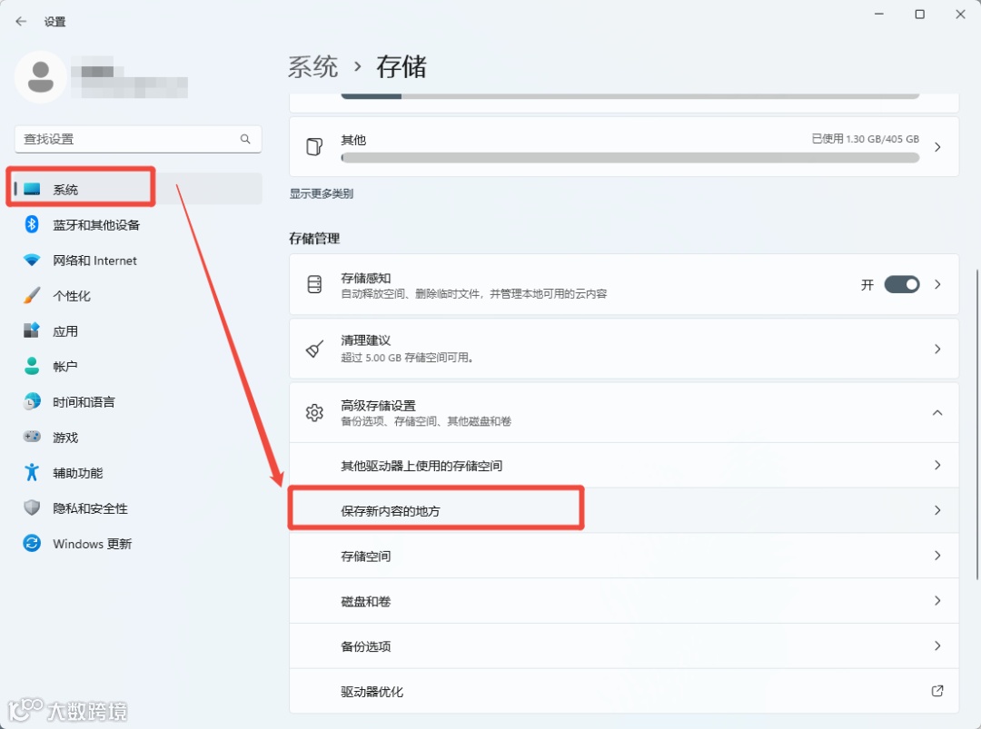 1.设置→ 系统 → 存储 → 更改新内容的保存位置。