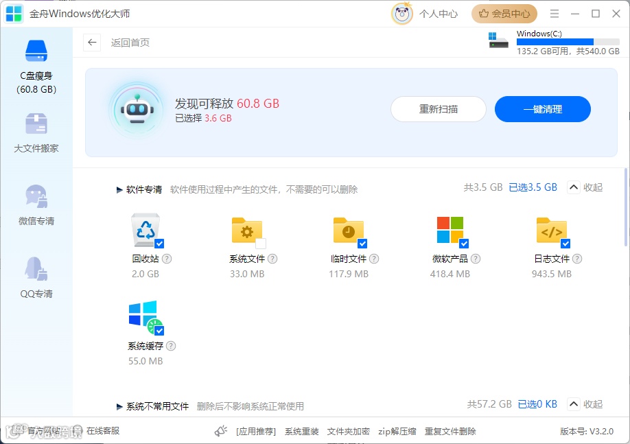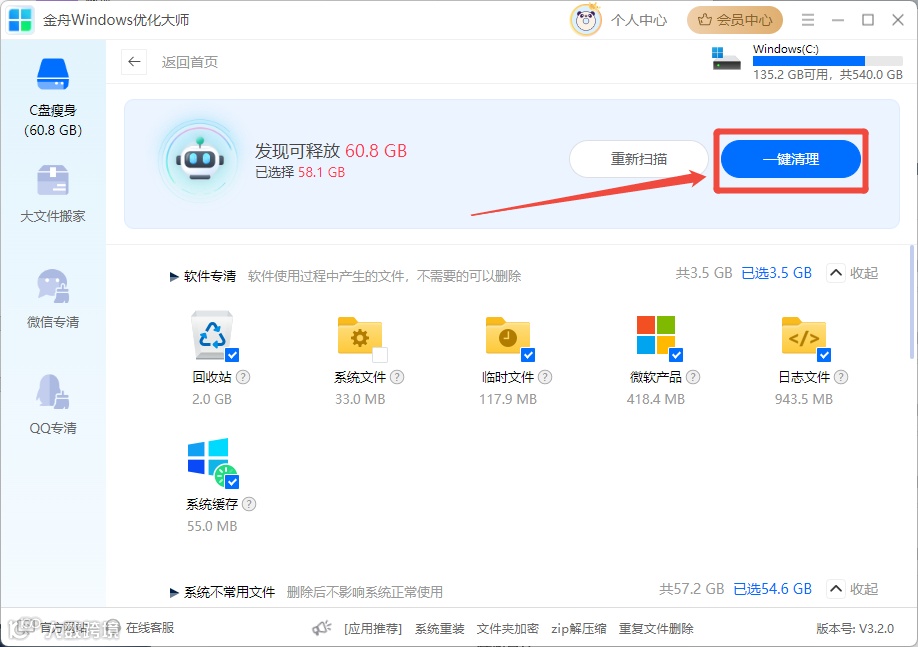 (如需进一步清理,可选择大文件搬家、微信/QQ专清、软件卸载等功能,快速释放更多空间)。