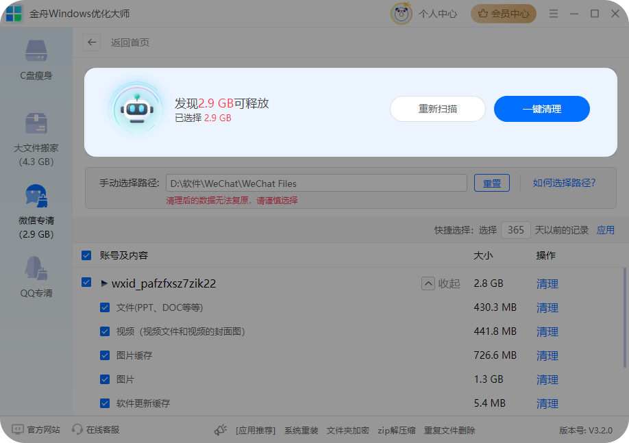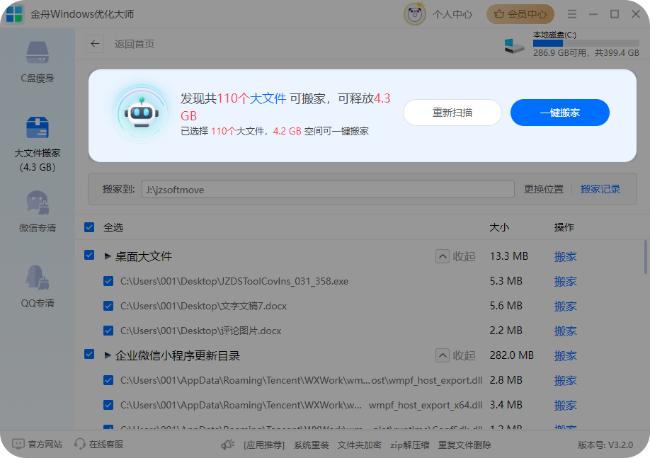 「金舟Windows优化大师」集c盘瘦身、大文件搬家、微信/QQ专清、软件管理等一体的电脑空间优化管理功能。