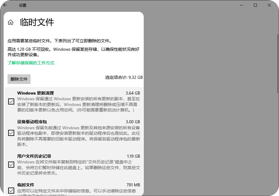 系统会开始扫描c盘上可清理的文件,扫描完成后,勾选临时文件、回收站文件、系统更新备份文件等。